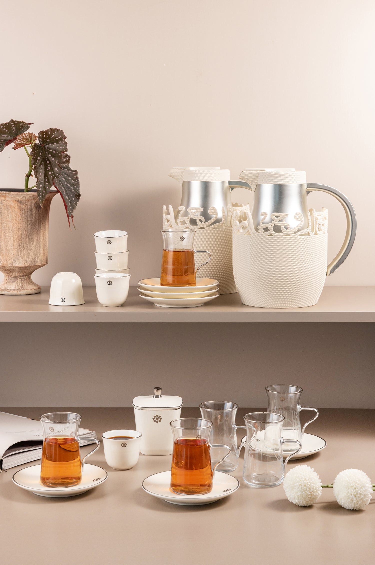 • Set includes –2 Flasks, 6 tea cups, 6 saucers, 6 Arabic coffee cups & a sugar bowl