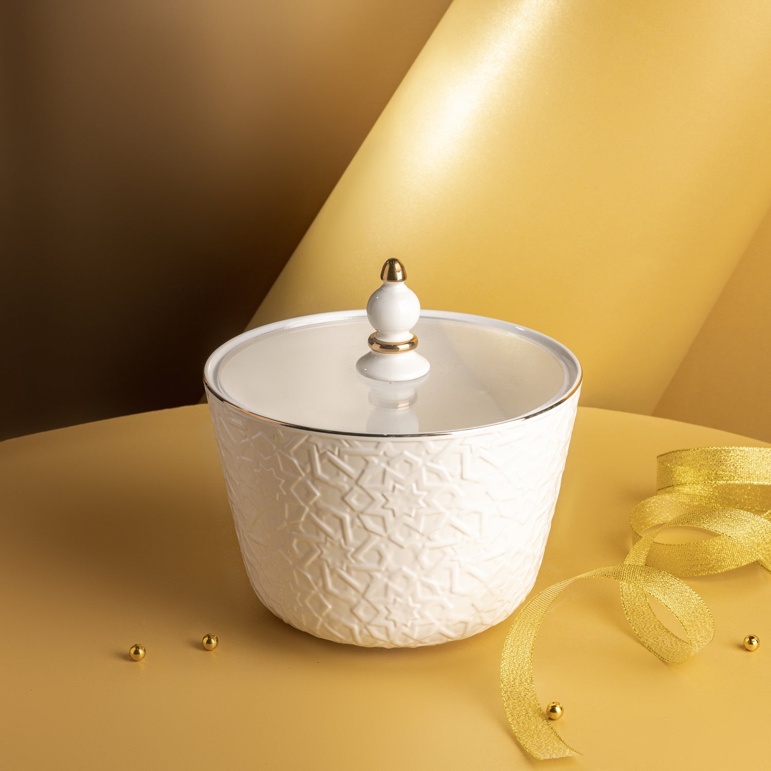 A large-sized date and sweets server that brings an air of elegance to your table. This unique and practical piece features a round porcelain base with a sleek and sophisticated design, complementing your dining setup. The dating server comes with a stylish and functional lid equipped with a handle for easy use. The lid’s design seamlessly matches the server’s aesthetic, adding an extra touch of refinement.