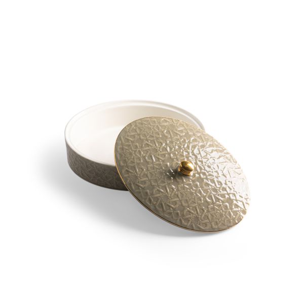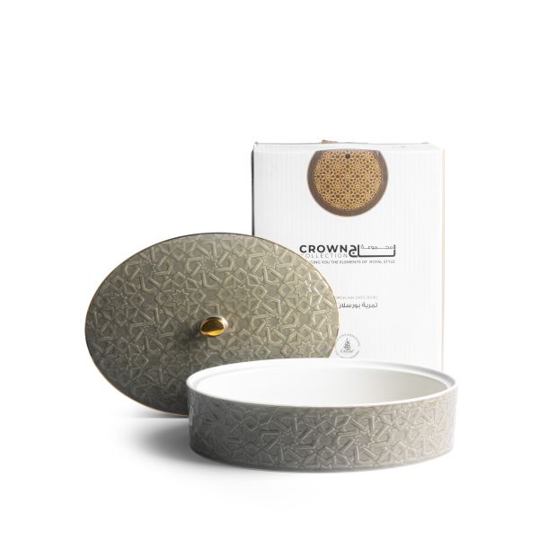A medium-sized date and sweets Date Bowl, a unique and practical piece with a round base made of porcelain, featuring an elegant and attractive design that complements the look of your table. The date bowl comes with an elegant and practical cover with a handle for easy portability. The cover features a design that matches the shape of the date bowl and adds a touch of elegance and beauty to it.