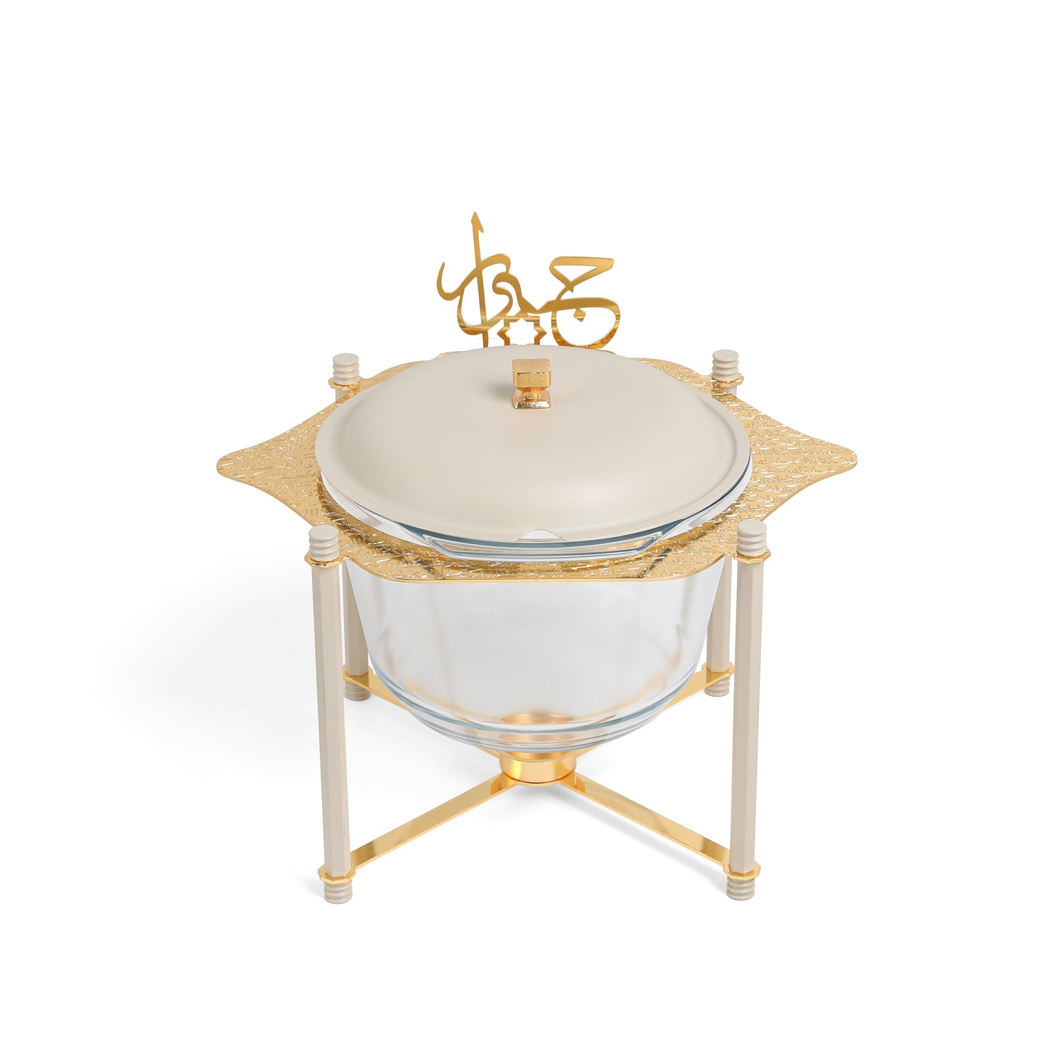 Serve in style with the Jiwar Elegant Soup Buffet with Engraved Gold Base, where traditional artistry meets modern luxury. Designed for refined gatherings, this stunning piece features a premium glass pot set atop a gold-plated stainless steel base, beautifully engraved with intricate Arabic calligraphy that celebrates cultural heritage.