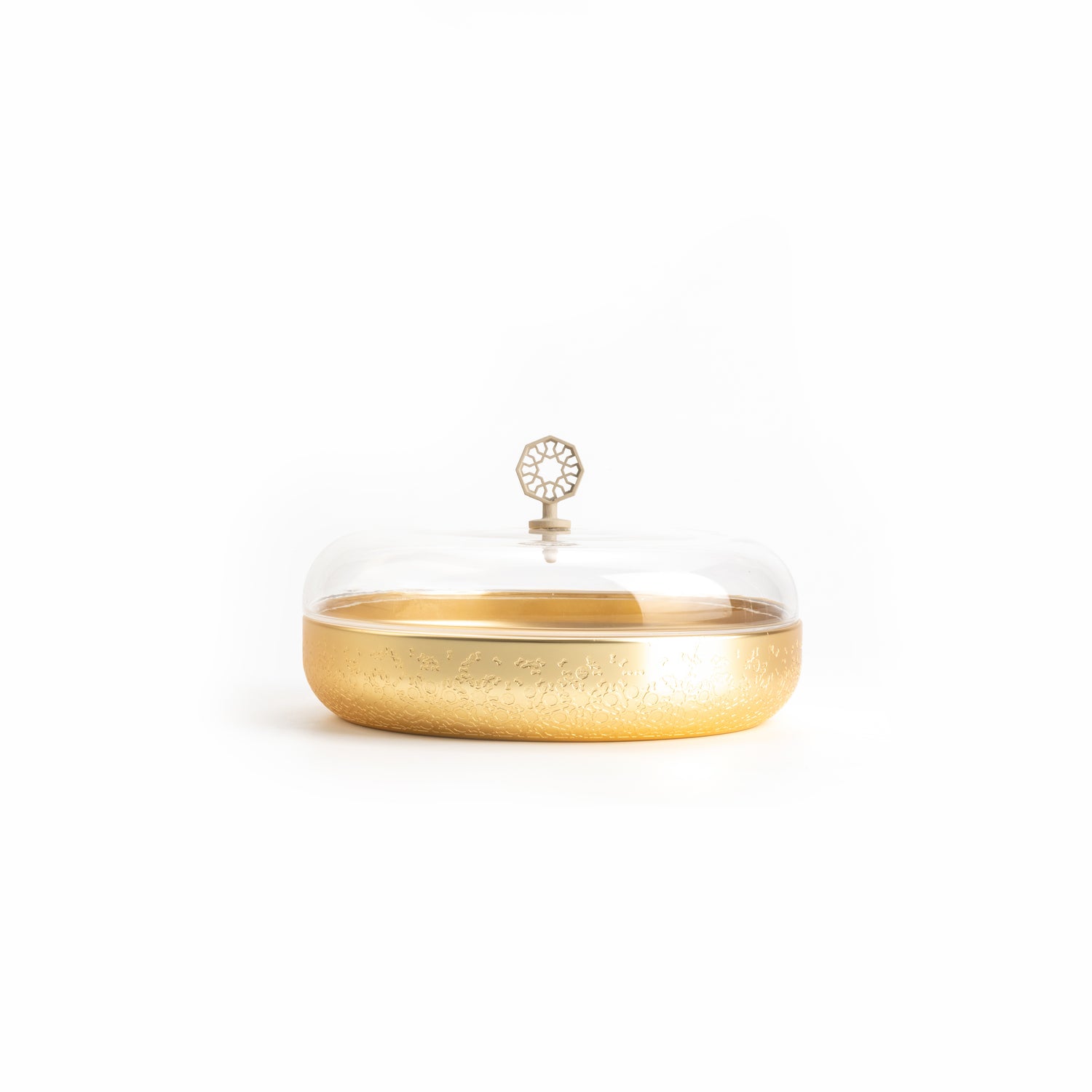 The stainless steel base features subtle decorative detailing, while the transparent acrylic lid offers visibility and easy access. Finished with a sculptural knob handle, the design feels polished and thoughtfully composed.