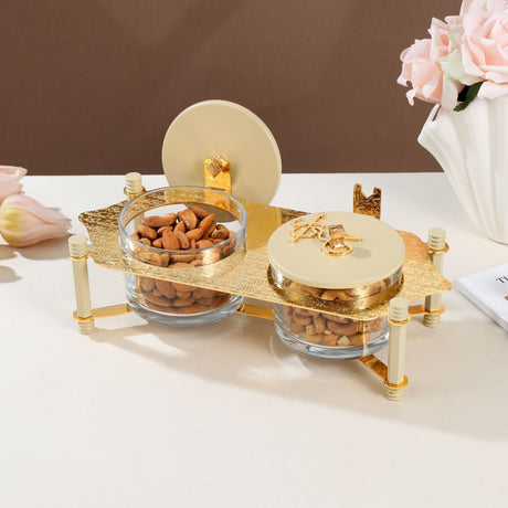 Jiwar - Dual Elegant Nut Serving Set with Engraved Base - Ivory & Gold