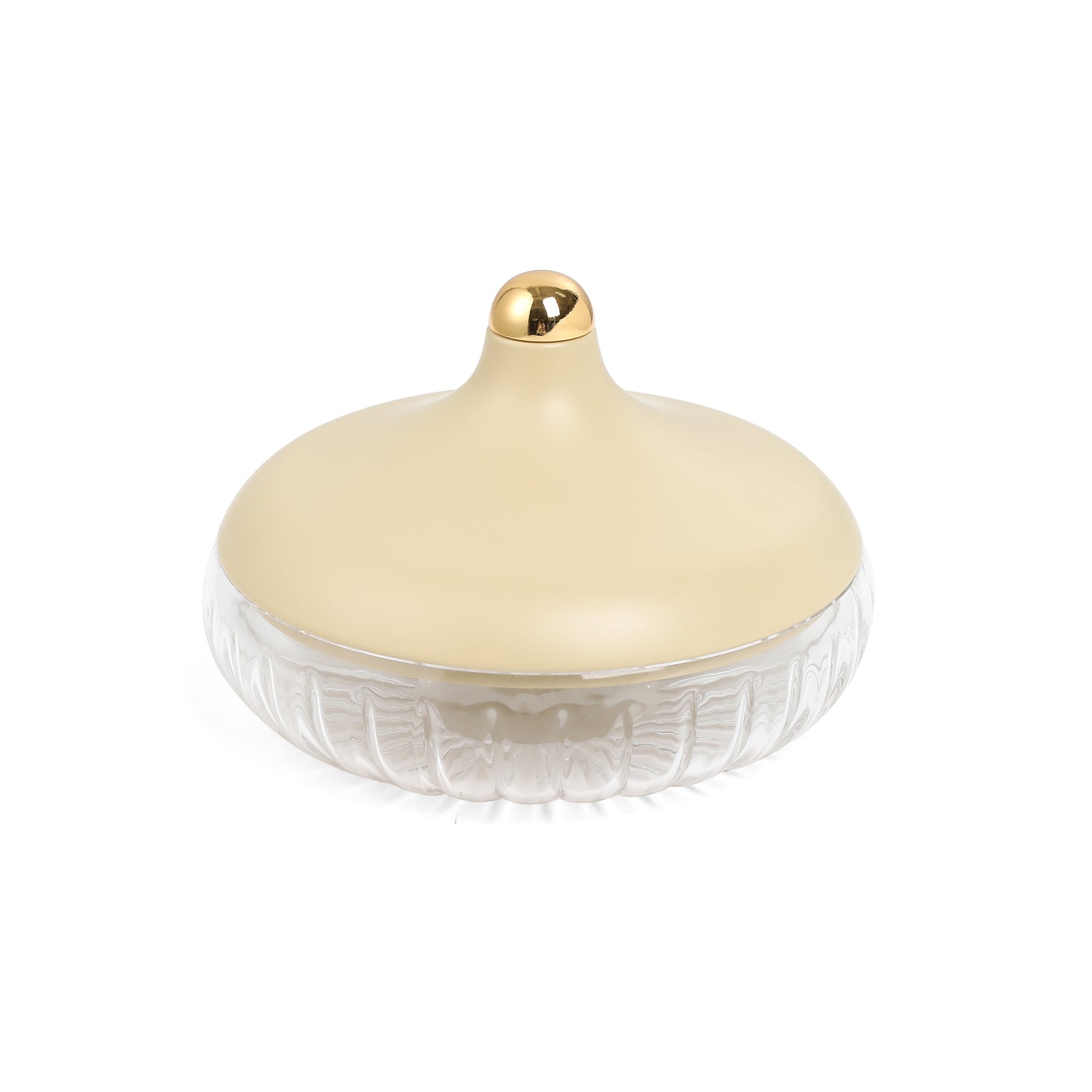 Featuring a high-quality glass bowl, it sits gracefully on a gold-plated stainless steel base, adorned with intricate Arabic calligraphy engravings that celebrate heritage and sophistication. The satin-finish stainless steel lid, crowned with a gold-tone handle, provides both functionality and refined aesthetics, keeping your treats fresh and beautifully displayed.