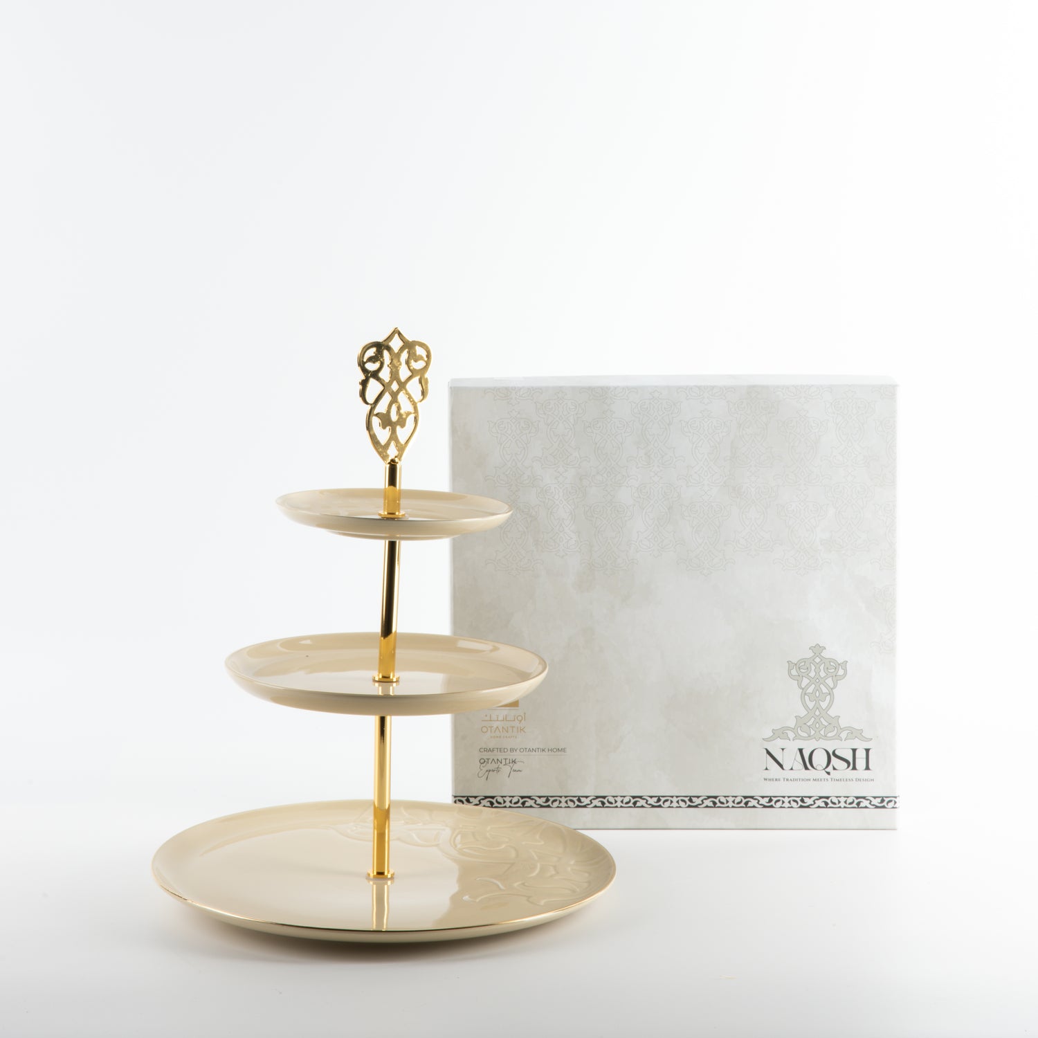 Crafted with precision and adorned with Otantik’s signature design language, each tier reflects balance, beauty, and thoughtful craftsmanship. Whether set for an afternoon tea, festive occasion, or elegant soirée, the Naqsh 3-Tier Plate elevates your table with understated sophistication.