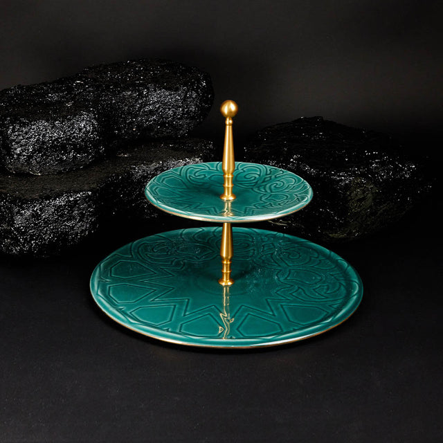 Indulge in our Luxury Majlis 2-Tier Serving Platter, designed with a stunning green and gold color scheme. Perfect for hosting parties and impressing guests. Elevate your dining experience with this unique and elegant piece. Keep your serving game strong!