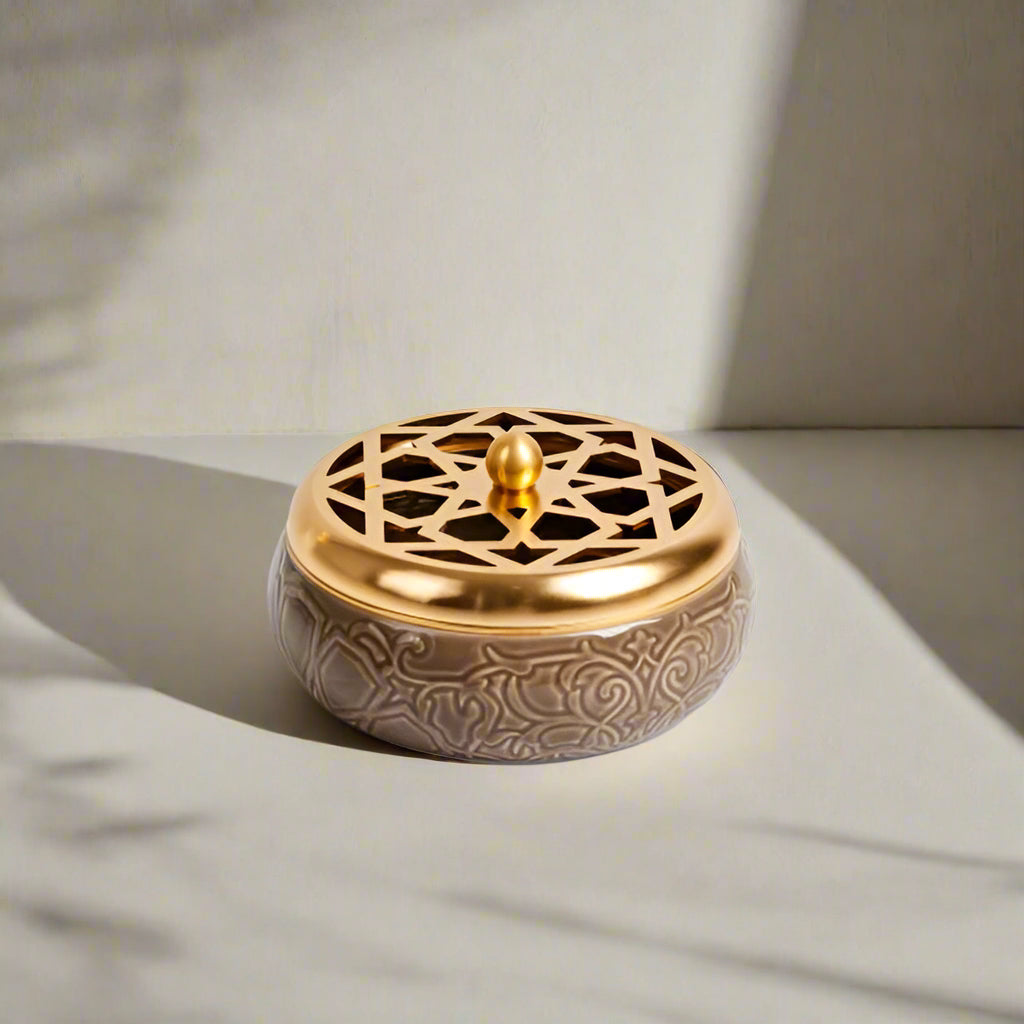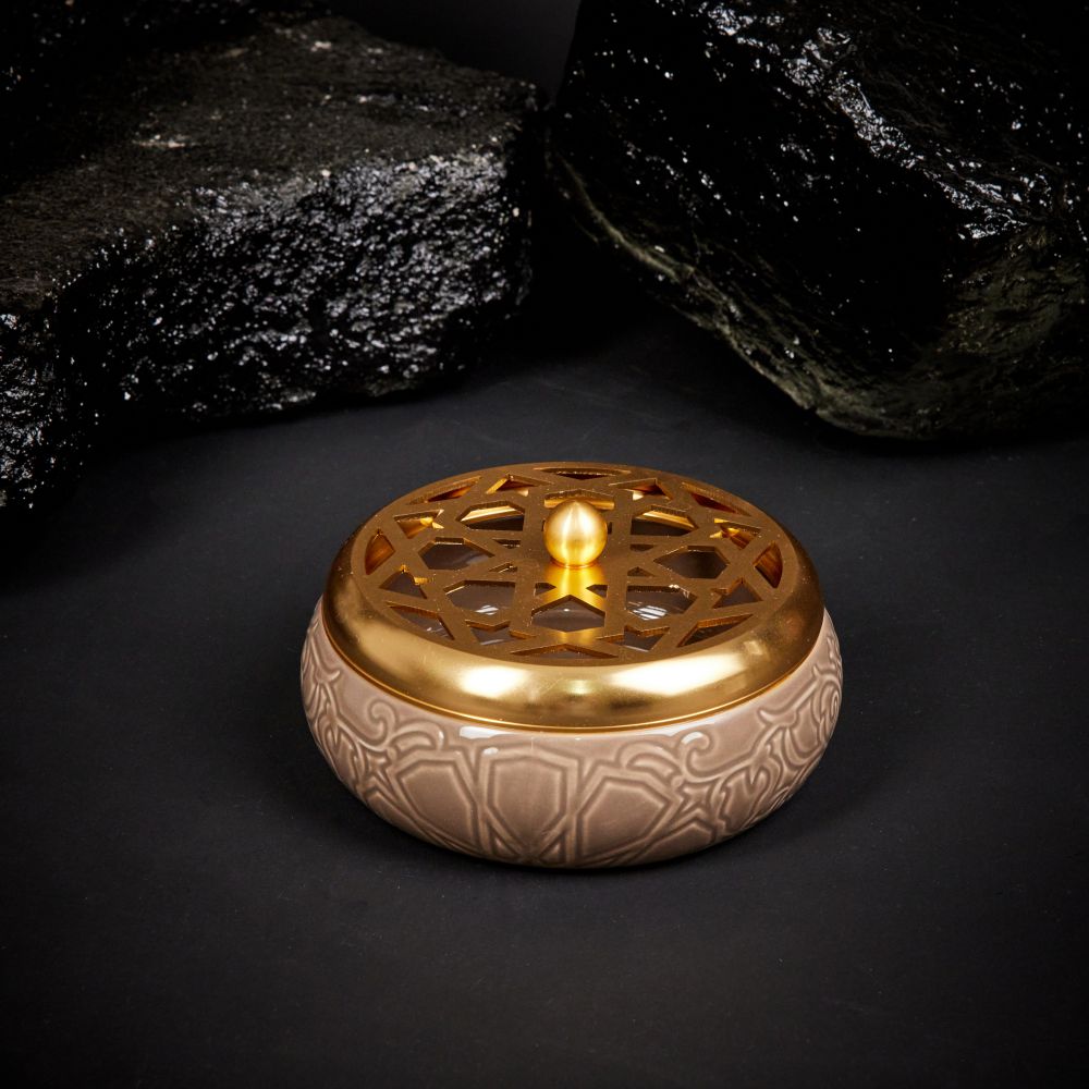 Add a touch of luxury to your smoking experience with this brown and gold ashtray! Perfect for any majlis, this ashtray not only looks elegant but also keeps your ashes contained. Say goodbye to messy smoking sessions and upgrade to a more stylish and functional option.