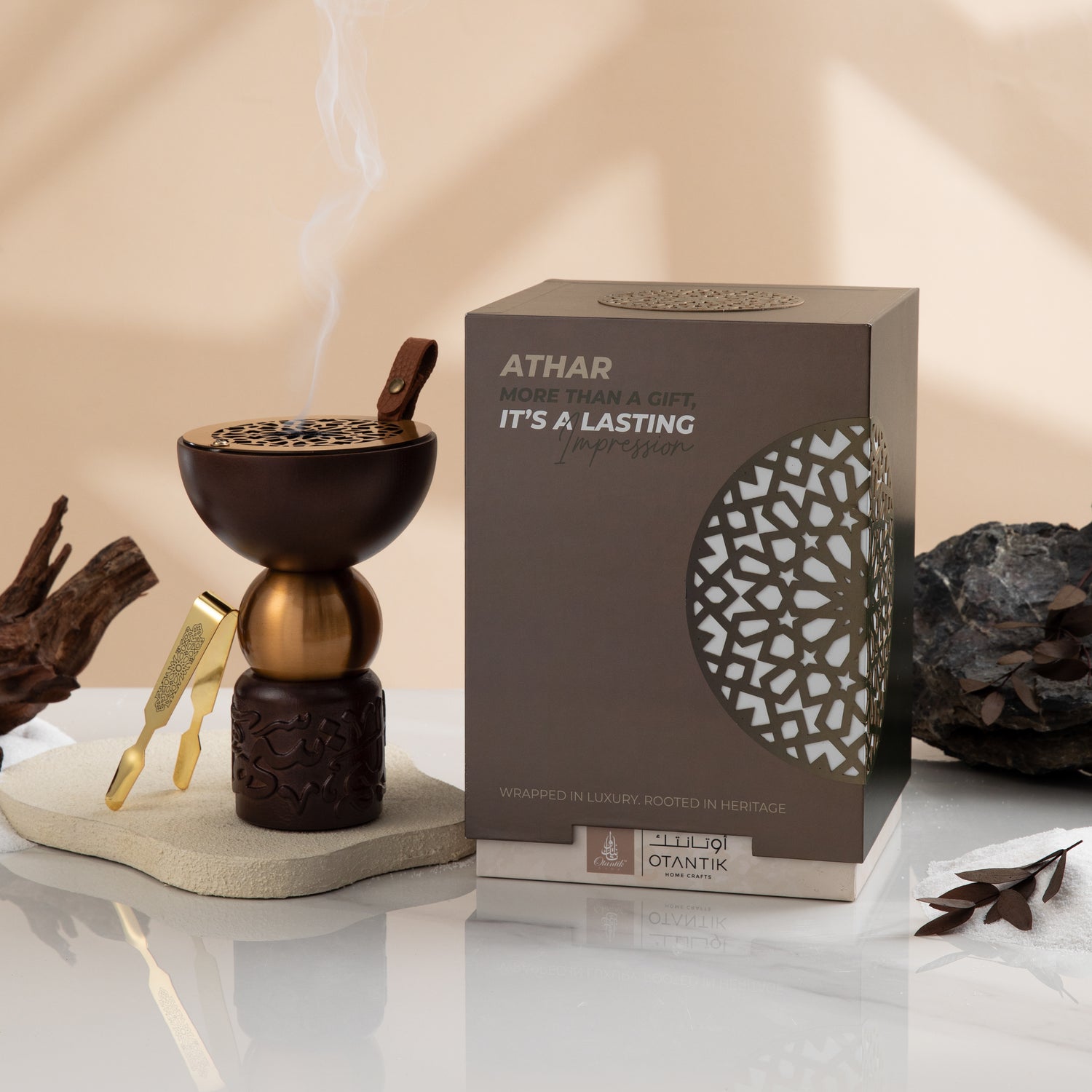 Featuring the sculptural Athar incense burner paired with a precision tong, this set provides everything needed for a clean, elegant incense experience. The burner allows incense to burn gently and evenly, releasing fragrance in soft, lingering trails, while the tong ensures effortless handling.