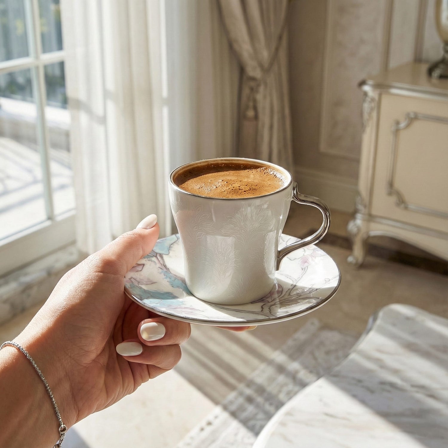 The Khuzama Cappuccino Set enhances everyday coffee with artistic flair and thoughtful proportions. Subtle floral detailing and metallic accents lend a polished presence to your table.