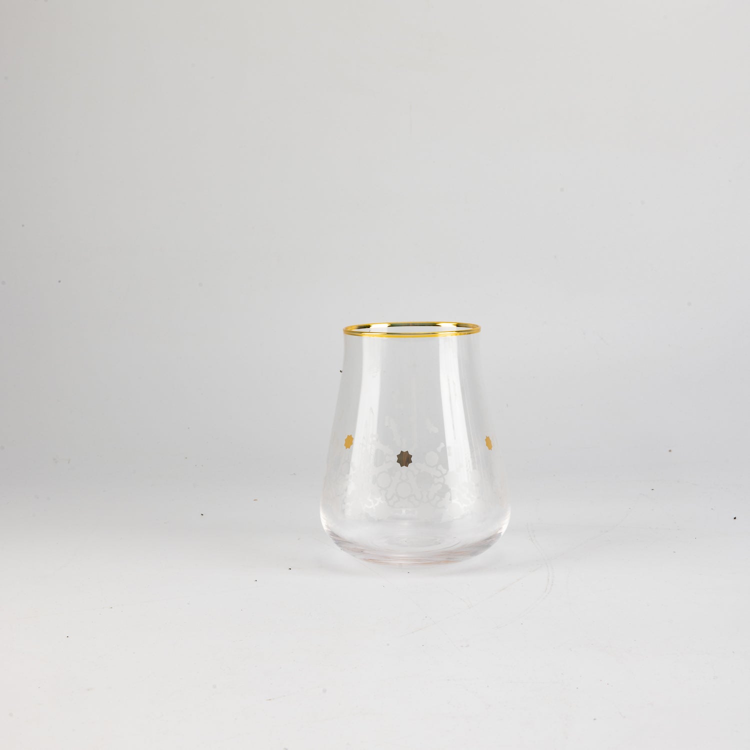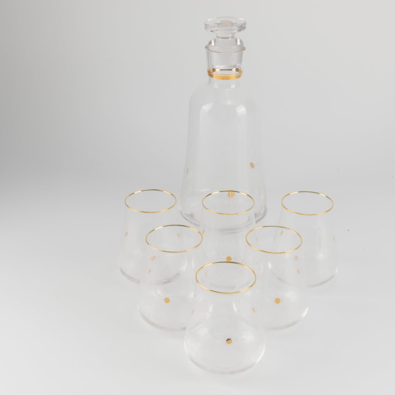 The sculpted jug features a balanced silhouette with a refined gold band near the neck, while the six shortglasses mirror the same elegance with subtle gold accents and graceful contours. The transparent glass enhances the clarity and color of your beverages, making it ideal for water, juice, or specialty drinks.