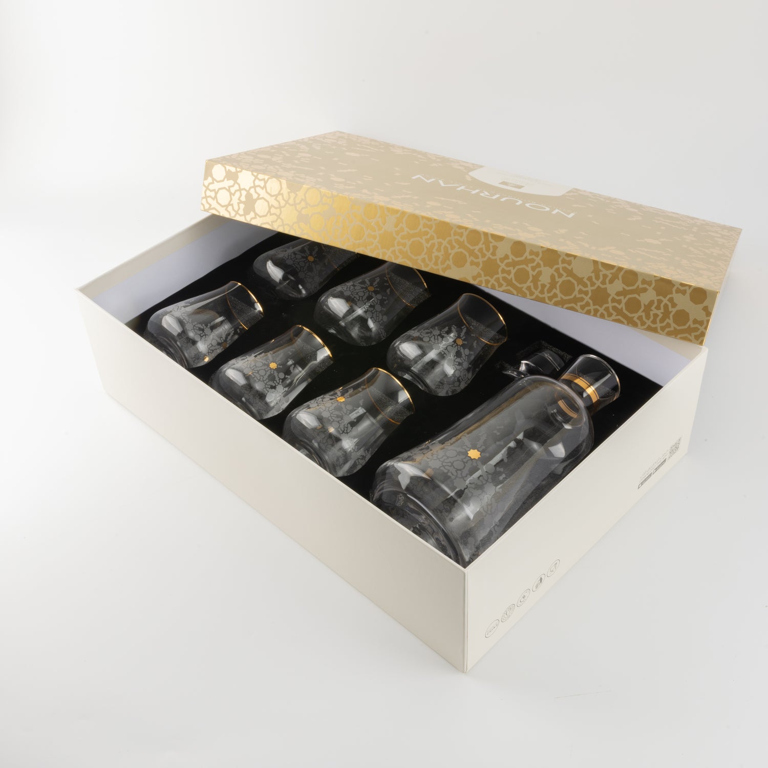 The Nourhan Jug Set embodies understated elegance and refined presentation. Designed in clear glass with delicate gold detailing, this set reflects architectural simplicity elevated by luminous accents.