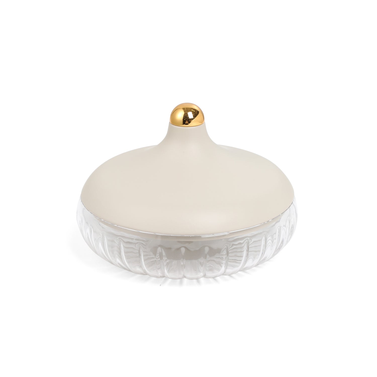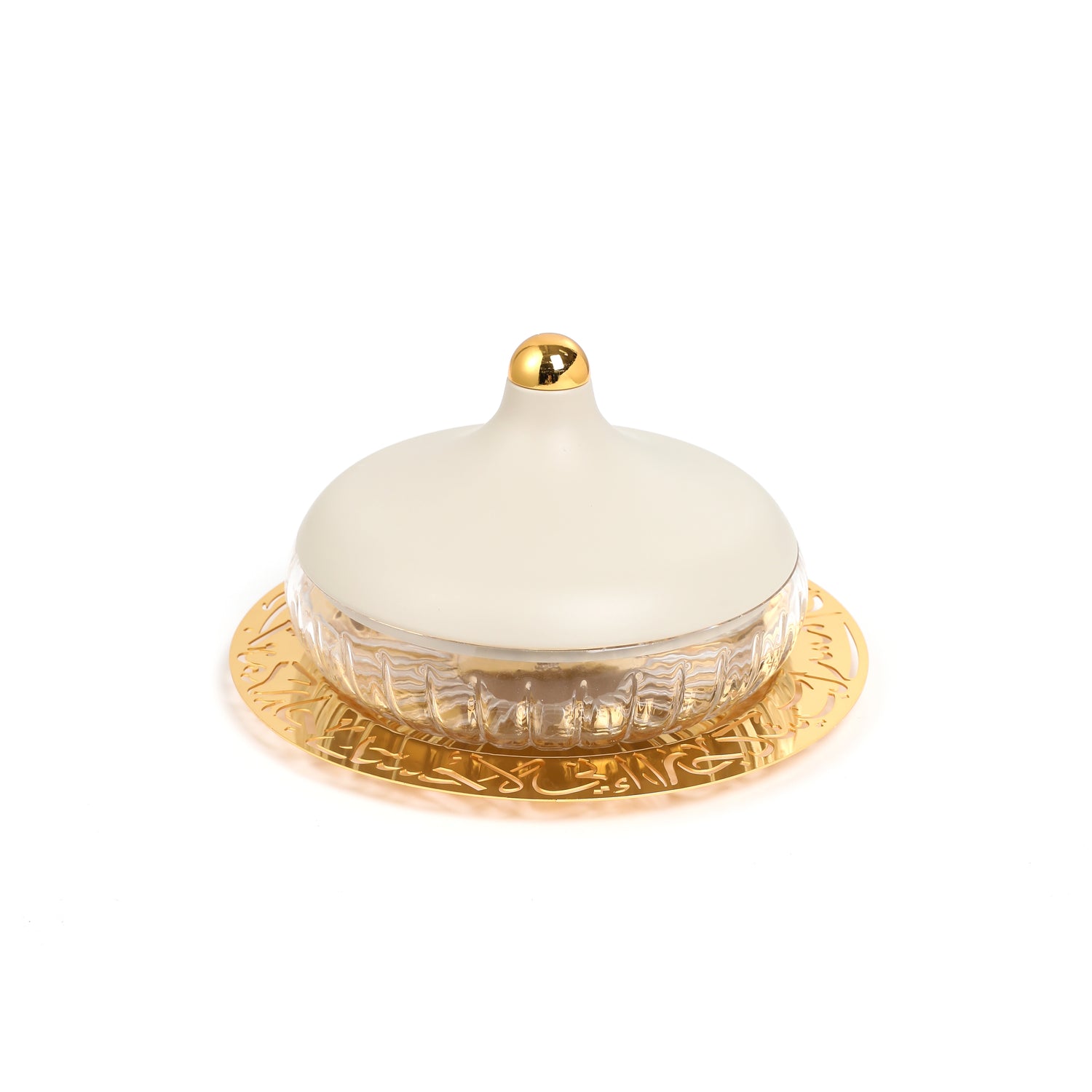 Featuring a high-quality glass bowl, it sits gracefully on a gold-plated stainless steel base, adorned with intricate Arabic calligraphy engravings that celebrate heritage and sophistication. The satin-finish stainless steel lid, crowned with a gold-tone handle, provides both functionality and refined aesthetics, keeping your treats fresh and beautifully displayed.