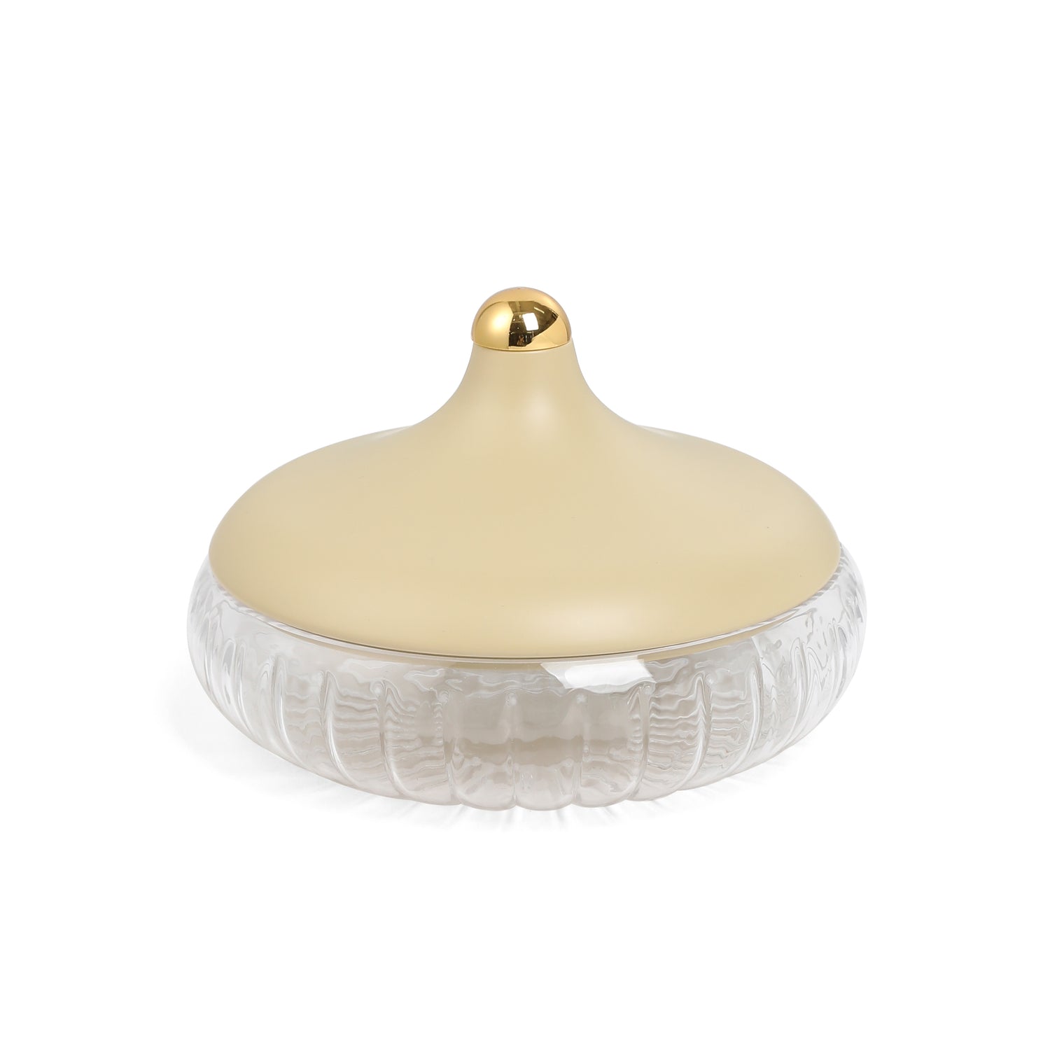 Featuring a high-quality glass bowl, it sits gracefully on a gold-plated stainless steel base, adorned with intricate Arabic calligraphy engravings that celebrate heritage and sophistication. The satin-finish stainless steel lid, crowned with a gold-tone handle, provides both functionality and refined aesthetics, keeping your treats fresh and beautifully displayed.