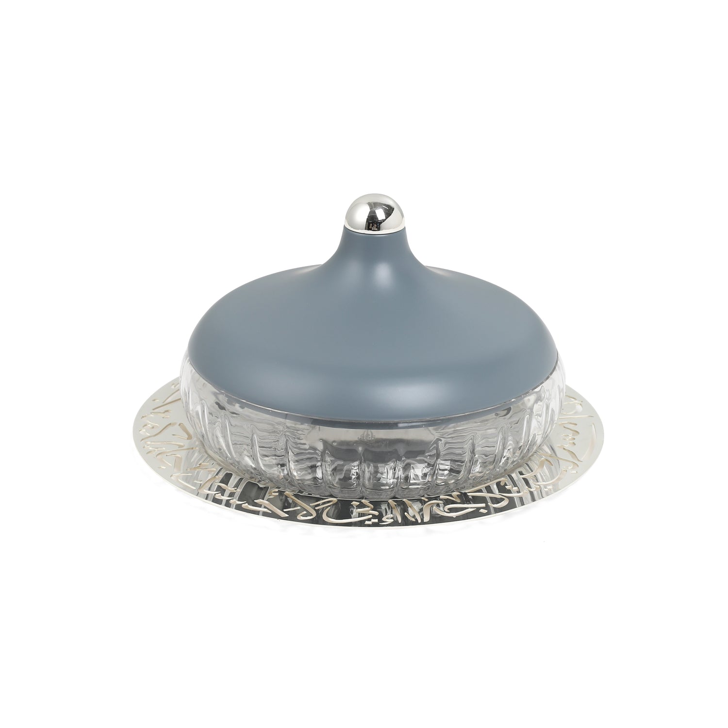 Featuring a high-quality glass bowl, it sits gracefully on a gold-plated stainless steel base, adorned with intricate Arabic calligraphy engravings that celebrate heritage and sophistication. The satin-finish stainless steel lid, crowned with a gold-tone handle, provides both functionality and refined aesthetics, keeping your treats fresh and beautifully displayed.