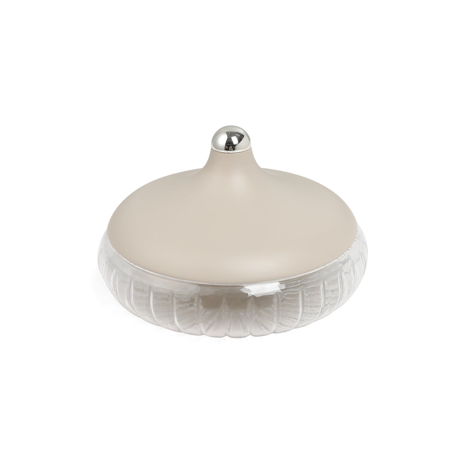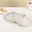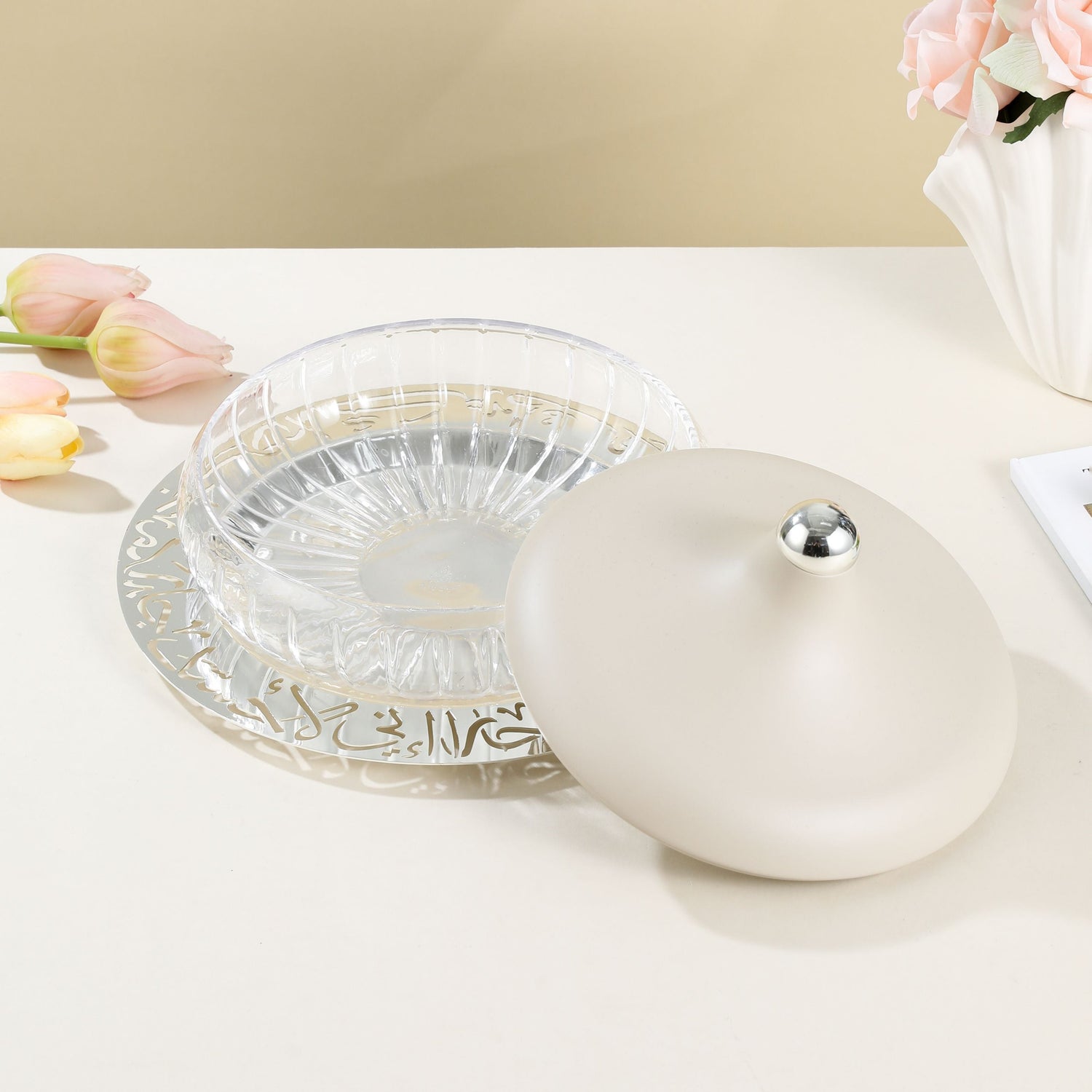 Featuring a high-quality glass bowl, it sits gracefully on a gold-plated stainless steel base, adorned with intricate Arabic calligraphy engravings that celebrate heritage and sophistication. The satin-finish stainless steel lid, crowned with a gold-tone handle, provides both functionality and refined aesthetics, keeping your treats fresh and beautifully displayed.