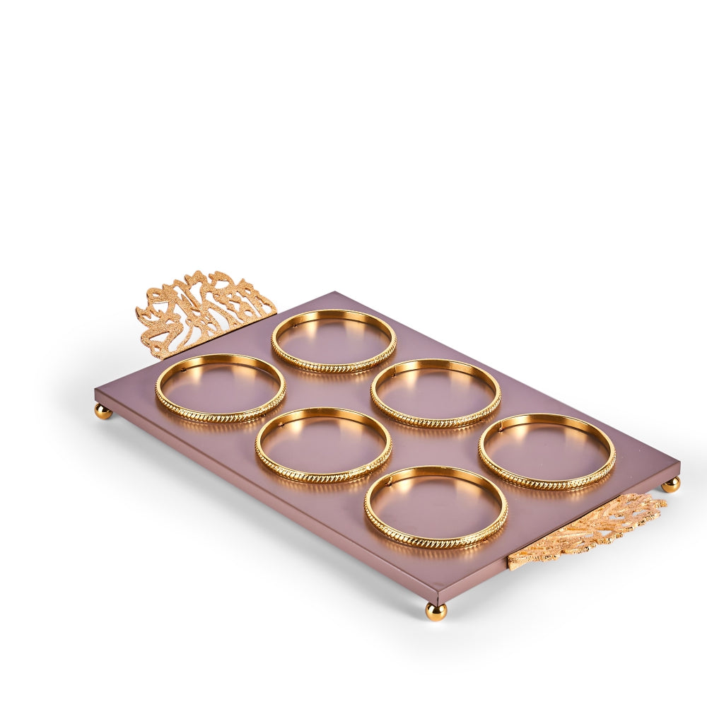 - El juego incluye: un soporte dorado, 6 tazones y 6 tapas de metal