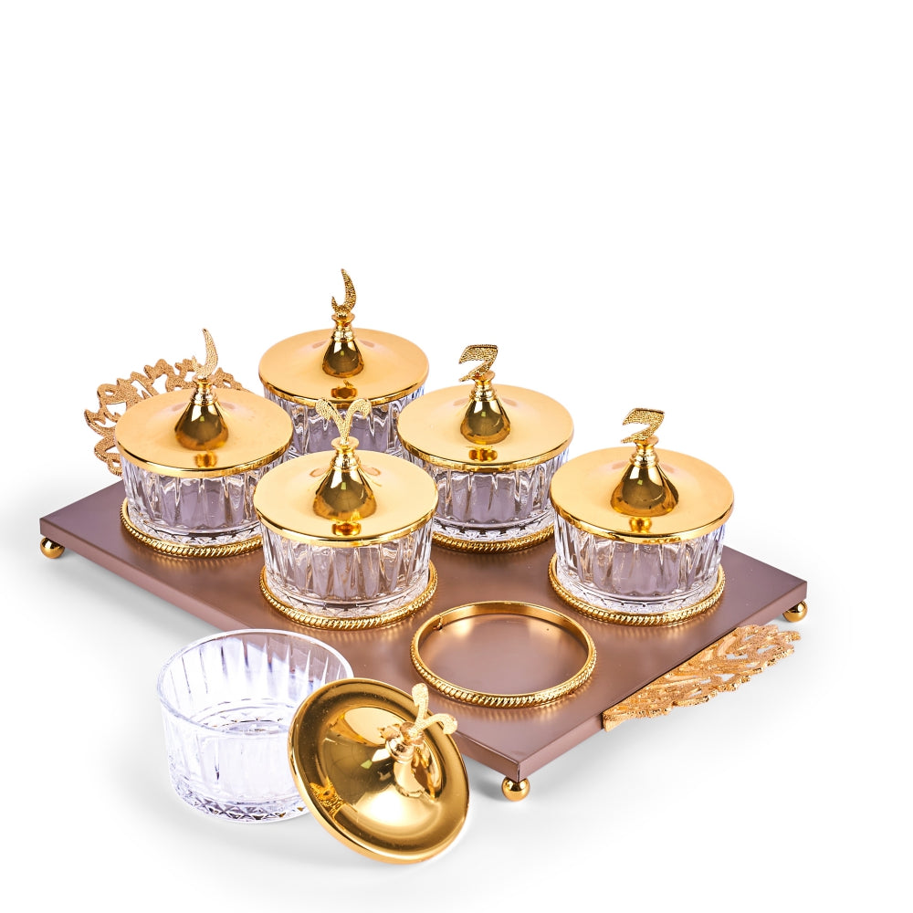 Presentamos los juegos para servir nueces de Zuwar, una bandeja de acero inoxidable adornada con exquisitos tazones y tapas de vidrio. Mejore su experiencia de entretenimiento con este conjunto sofisticado, perfecto para servir y conservar sus nueces favoritas con estilo.