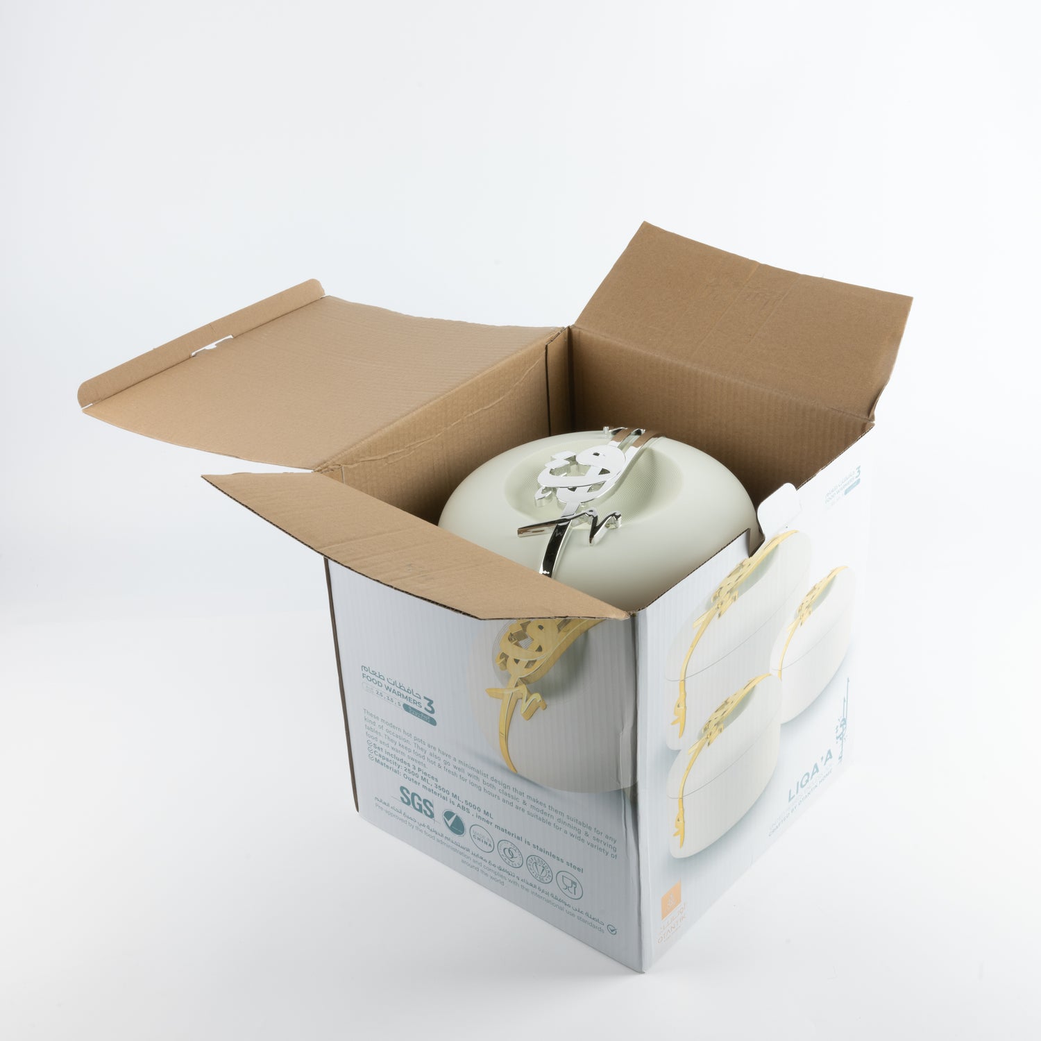Crafted with a strong plastic exterior adorned with intricate, elegant details and a premium stainless steel interior, these thermos containers bring a touch of luxury to your serving or storage needs. The airtight rotating lid ensures a secure seal, keeping food fresh and preventing spills. Ideal for home dining, catering events, or family gatherings, this versatile set includes three different sizes, perfect for serving appetizers, main dishes, or larger meals. Whether hosting a dinner or transporting food, the Liqa’a Food Thermos/Warm Serve Set offers a refined and reliable solution for every occasion.