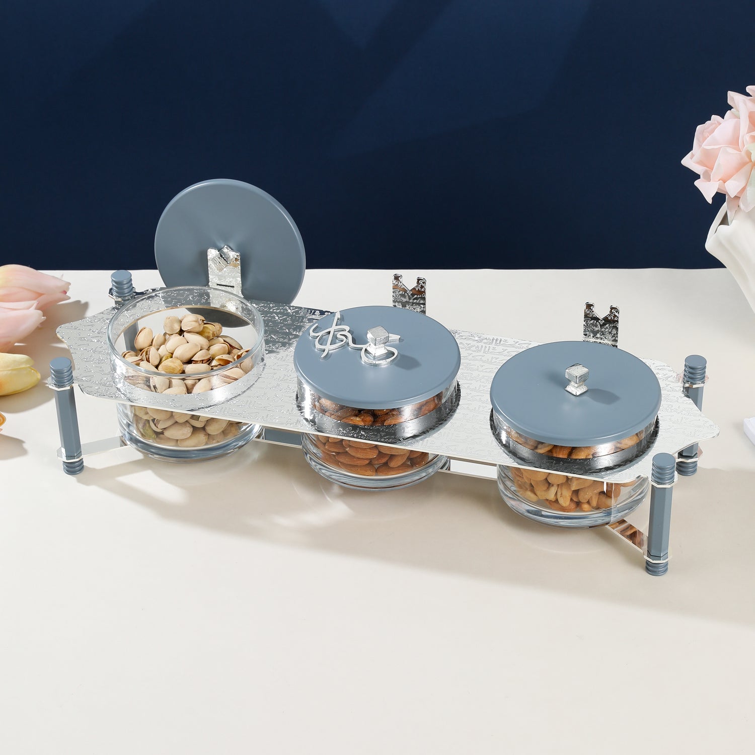 1X Jiwar - Triple Elegant Nut Serving Set with Engraved Base - Haze BLue & Siver