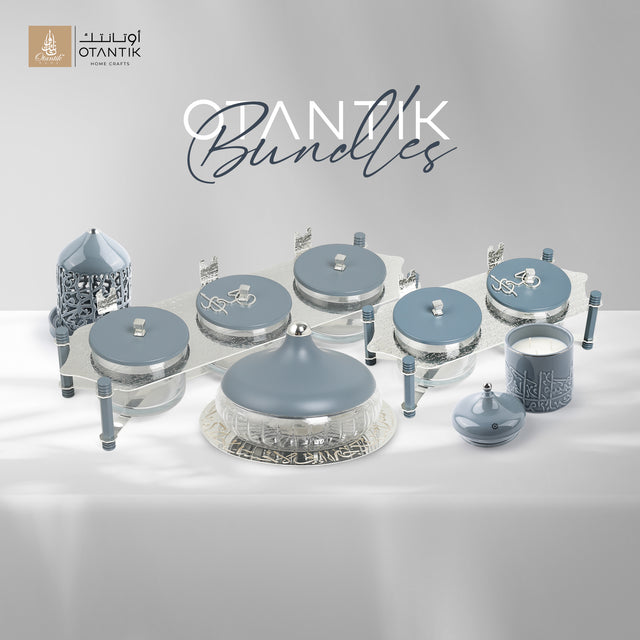 Elevate your hosting or gift-giving with The Delight Tray Bundle—a curated collection of elegant serving pieces and signature candleware. From engraved nut servers to a beautifully detailed date box and a luxurious candle centerpiece, this set captures Otantik’s signature charm in serene Haze Blue & Silver. Perfect for Eid, housewarmings, or personal indulgence.