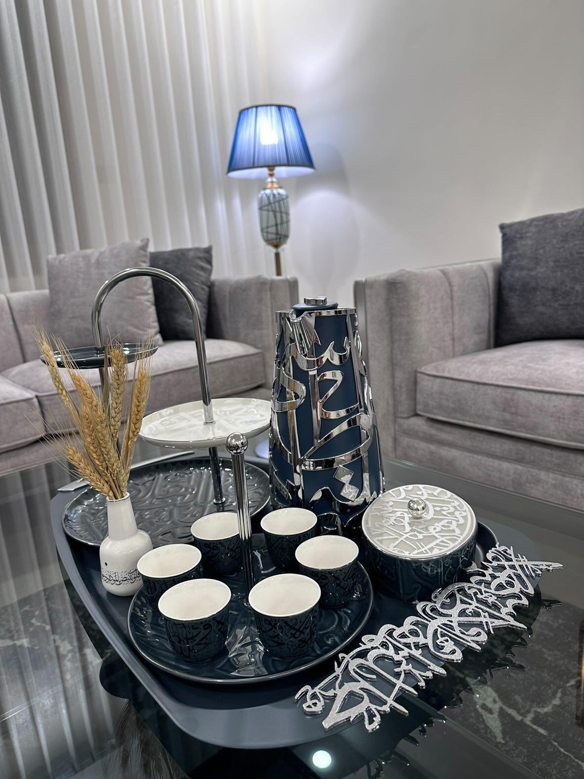 Diwan - Arabic Coffee Cups With Holder - Dark Blue & Silver